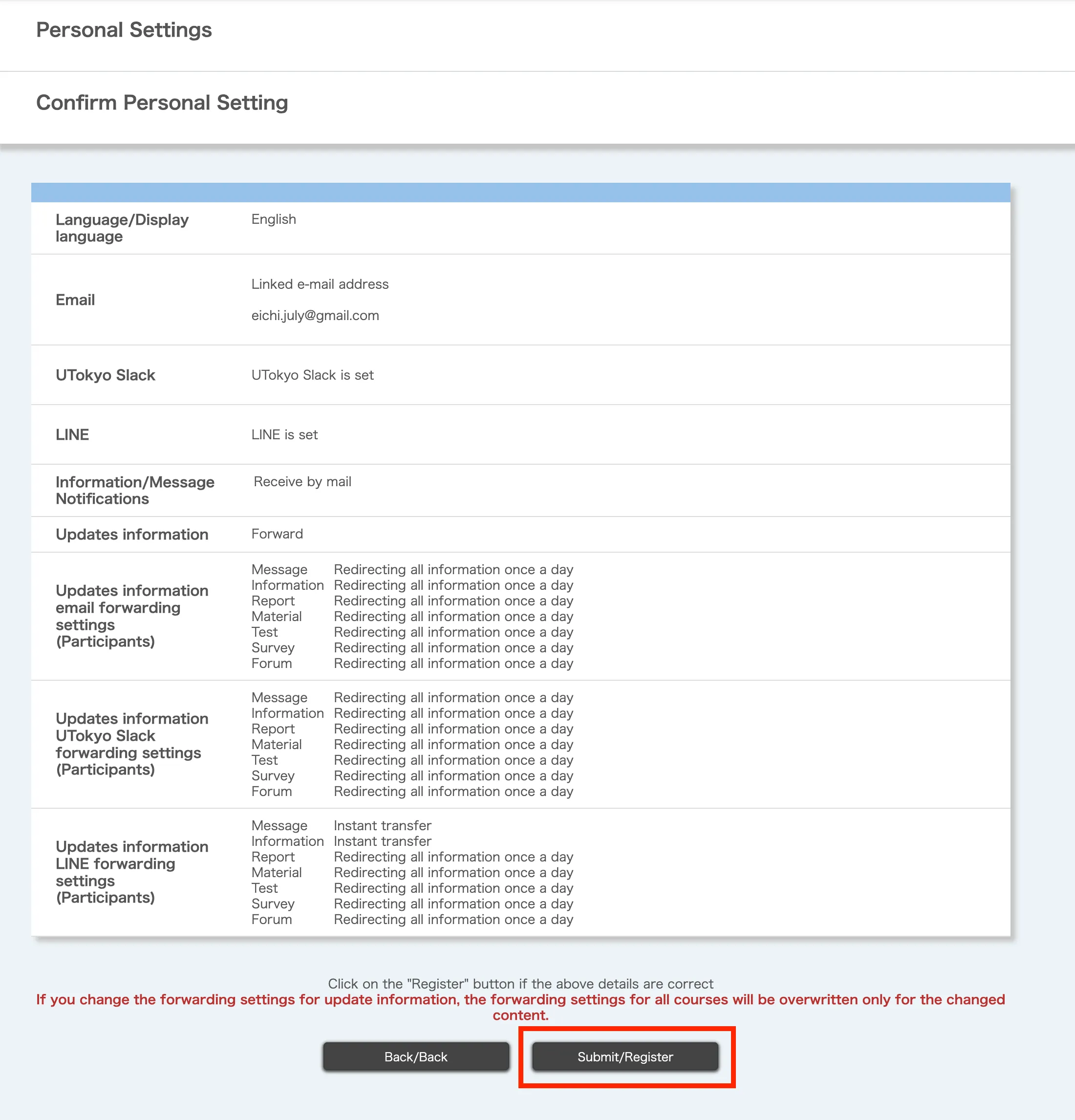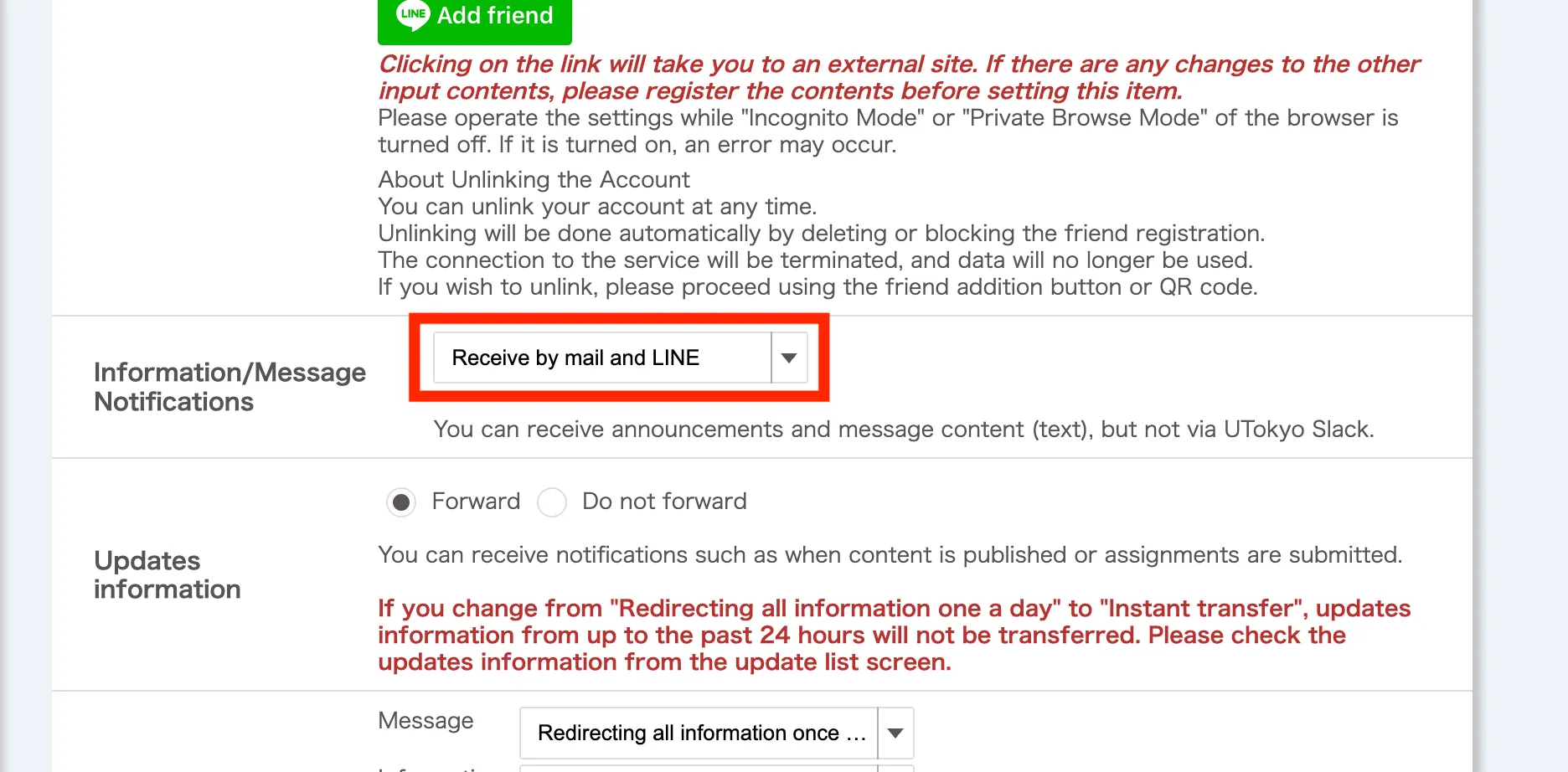 - Click the relevant link under the “Updates information email/LINE/UTokyo Slack forwarding settings” (in blue) at the top right of the screen.