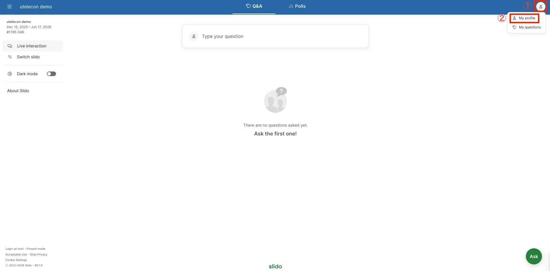 Slidoの画面が英語で表示されている場合は,以下の手順で言語を日本語に変更することができます.