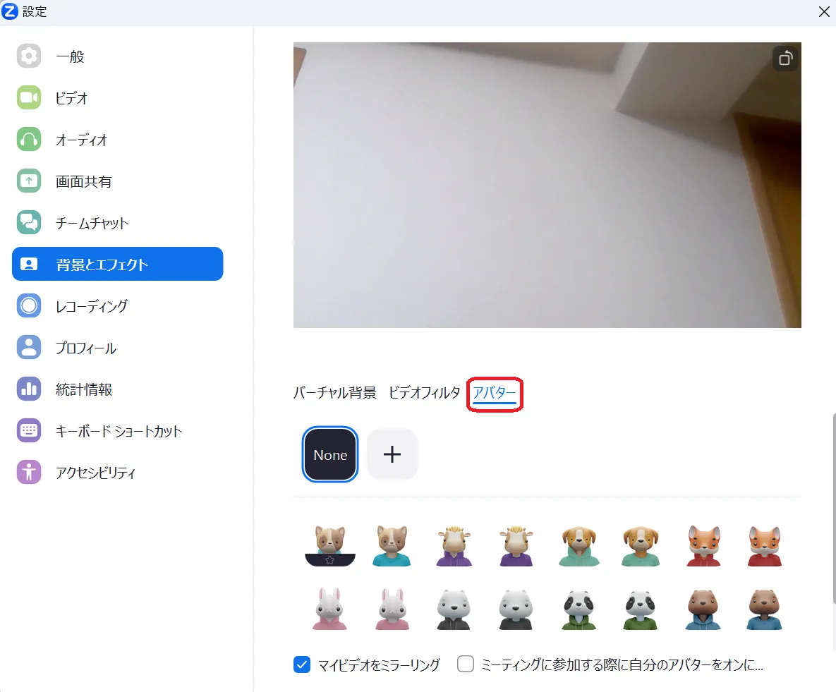 3. 好みのアバターを選んでください.(アバターを設定するとカメラに映る背景が表示されなくなり,アバターだけが表示されるようになります.バーチャル背景を設定している場合は設定している画像がアバターの背後に表示されます.) ※バーチャル背景設定時